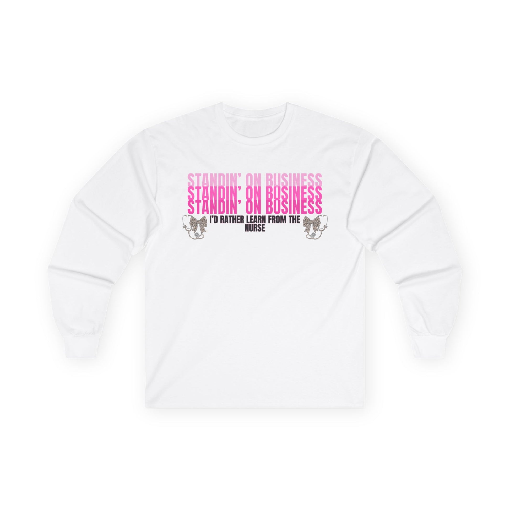 This long-sleeve tee blends a vintage, lived-in feel with clean, confident graphics — a wearable nod to nurses who carry both care and hustle. The slightly thicker, environmentally-minded cotton gives weight and structure, while the tubular knit and shoulder tape keep the silhouette smooth and comfortable. Bold pink lettering and small nurse motifs sit across the chest, making a subtle statement without shouting. Wear it on late shifts, casual meetups with coworkers, or days off when you still want your profession to quietly lead the conversation. It feels like the kind of shirt you reach for when you want to look put-together but comfortably real.